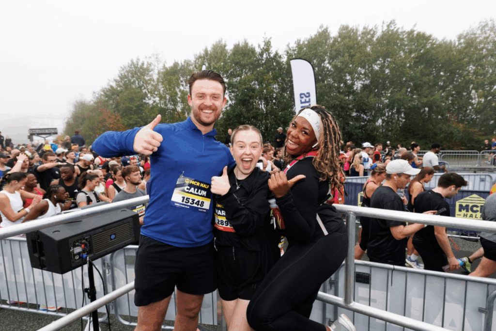 Coronation Street cast Harriet Bibby, Channique Sterling-Brown and Calum Lill set off together under the Trafford Arch, in high spirits and some nerves for Channique, who was taking on her first official half marathon!